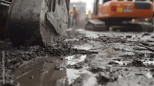 construction, work, dirt, mud, wet, slurry, shoveling, wheel, machinery, construction site, grey, monochrome, industrial, landscape, urban, gritty, texture, depth, shadow, contrast, equipment, vehicle, road, concrete, debris, water, surface, construction equipment, site, heavy machinery, closeup, blurred, asphalt, urban scene, work in progress