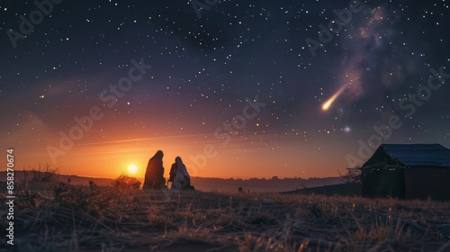 Photograph of the Nativity - Scene with the Holy Family with a comet at sunrise.