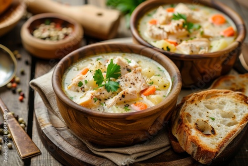 Photographed natural light chicken potato chowder soup green pepper and carrot in bowls with bread on side