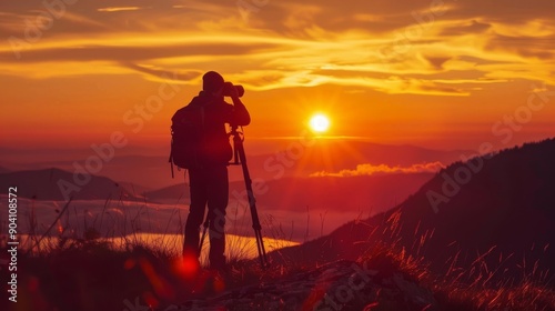 sunset, mountain, photographer, silhouette, camera, tripod, golden hour, dramatic sky, cloud, horizon, scenic, beautiful, colourful, vibrant, peaceful, tranquil, adventure, travel, exploration, inspiration, wilderness, backpacker, hiker, sunrise, nature, landscape, breathtaking, dawn, dusk