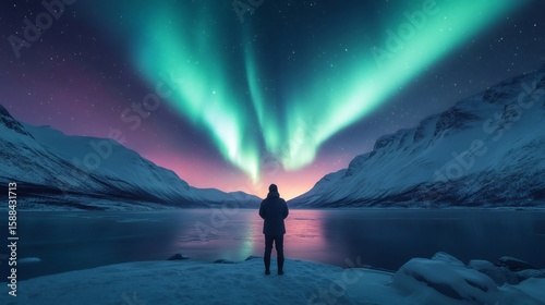 Photographer observing stunning northern lights over frozen lake in snowy mountains