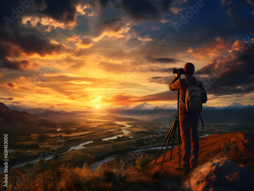 Photographer with camera and tripod capturing beautiful scenery of nature Greenery, mountains, trees and sunset sky, generative AI