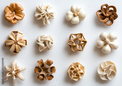 Photographs of garlic on a white background, captured from different angles and positions. High-resolution photography, high definition, sharp focus, minimal contrast, soft shadows, clean and