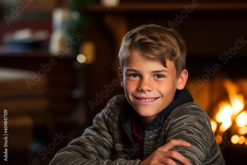 Photography in the style of pensive portraiture of a grinning mature boy wearing a comfortable pair of jeggings against a cozy fireplace background. With generative AI technology