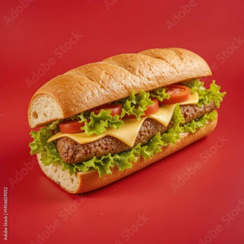 sandwich, sub, baguette, sausage, tomatoes, lettuce, cheese, fast food, snack, lunch, red background, fresh, tasty, delicious, food photography, studio shot, hi-res, isolated, meal