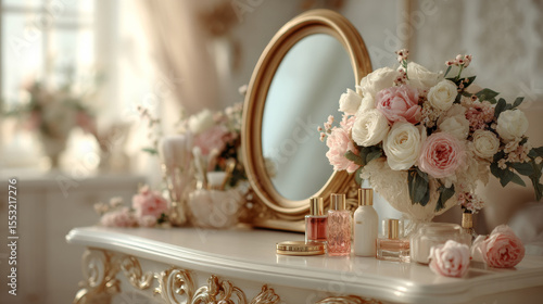 Photorealistic 4K imagea Scandinavian-style vanity with soft pastel flowers, stylish beauty products, and a sleek mirror above the ornate table