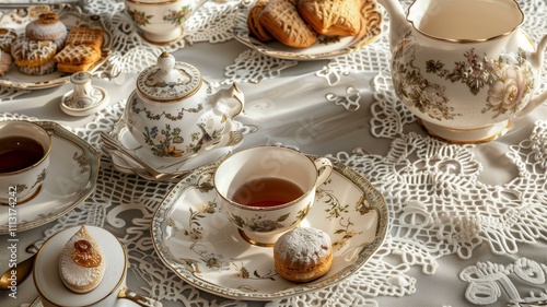 photorealistic, closeup, elegant, pastry, china, porcelain, teapot, teacup, saucer, floral pattern, delicate, afternoon tea, sweet, dessert, vintage, classic, table setting, cosy, refined, luxurious, traditional, sophisticated, hi-res, realism, food photography, still life, aesthetic, decorative