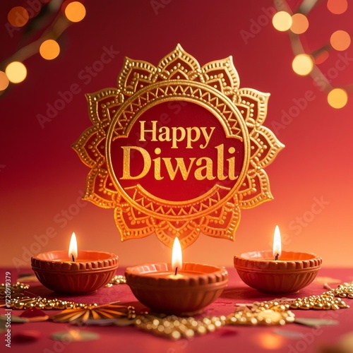 Photorealistic Diwali composition with deep red gradient, textured golden mandala patterns, hanging clay diyas, elegant cursive 'Happy Diwali', soft light effects, festive theme