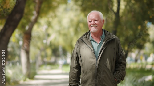 elderly, man, male, senior, aged, 70, 5, old, portrait, person, human, grandmother, smile, smiling, happy, cheerful, joyful, walking, park, tree, grass, sunlight, nature, environment, lifestyle, wellness, health, vitality, active, ageing, graceful, confidence, independence, realistic, photorealistic, detailed, character, model, anatomy, generative, ai, illustration, caucasian