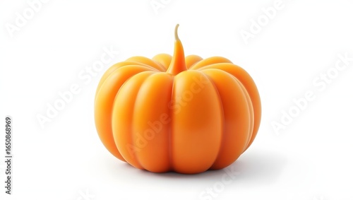 Photorealistic image of an orange pumpkin-shaped candle isolated on white. Carved ridges, smooth texture, with a small wick on top. Soft lighting creating a warm glow and gentle shadows. 2