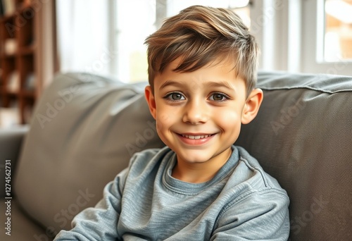 human, gentle, soft, blurred, portrait, space, photorealistic, contrasting, couch, eye, light, room, shadow, natural, even, body, subtile, harsh, overweight, children, partially, lighting, noise, living, smile, people, sharpened, boy, sharp, casual attire, outfit, visible, texture, professional, copy