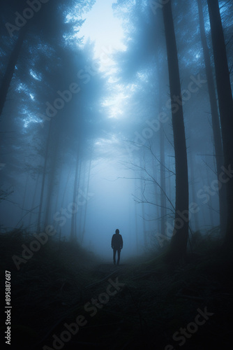 photorealistic shot foggy forest with small person for scale, hyper realistic, cinematic dark light