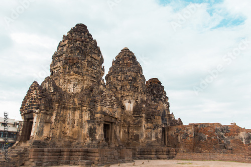 Phra Prang Sam Yod label with Pra Prang Sam Yod background in Lopburi, Thailand. Religious buildings constructed by the ancient Khmer art