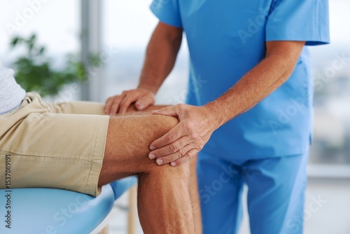 Physical Therapist Conducting Knee Rehabilitation for Patient Recovery in Clinic Setting Focused on Healing Process