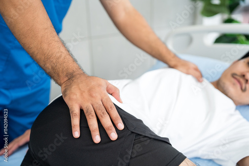 Physical therapy. Male Nurse aids young man in recovering from spine injury and providing orthopedic massage Orthopedic healthcare and chiropractor with person for physical therapy rehabilitation