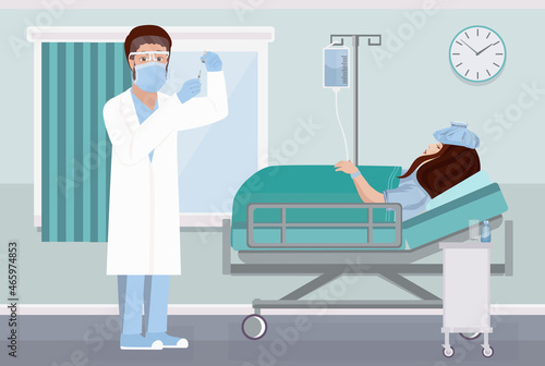 adult, bed, care, check-up, clinic, concept, diagnosis, doctor, exam, female, health, help, hospital, ill, disease, illustration, injection, lying, male, man, medicals, medicine, nurse, patient, physician, practitioner, professional, room, sick, specialist, stethoscope, surgery, syringe, therapy, treatment, vector, visit, ward, woman, young