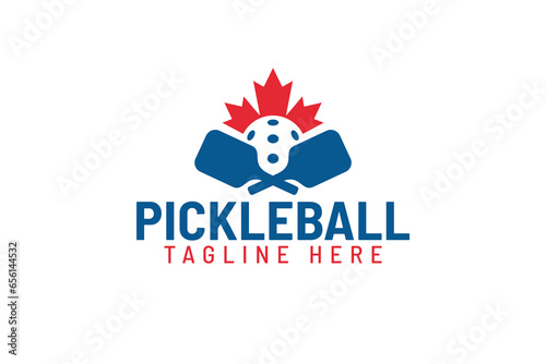 pickleball logo with a combination of a ball, paddles, and a maple leaf for pickleball club, tournament, training, etc.