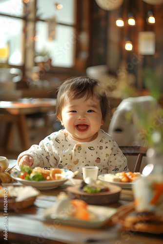 Picture of an Asian toddler sitting in a dining chair.