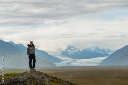 Picture of asian woman solo travel enjoy at nature on the top mountain with Skaftafellsjokull glacier as a Background in Iceland