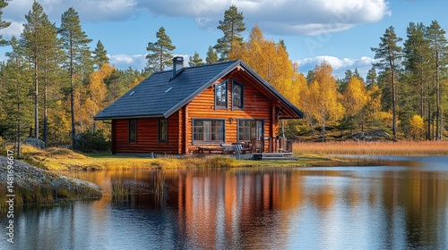 Picturesque autumnal log cabin reflecting on a calm lake.