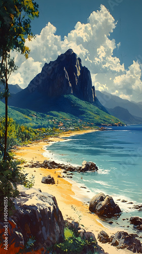 beach, mountain, sky, scenic, ocean, coast, landscape, nature, vacation, travel, tropical, paradise, summer, sun, palm, tree, rock, sand, water, blue, green, yellow, view, vista, idylli, serene, calm, dramatic, picturesque, beautiful, hill, cliff, shoreline, horizon, sunlit, elevated, viewpoint, lush, vegetation, people, gold, breathtaking, colourful, high-coloured, painting, art, detailed, impressionistic