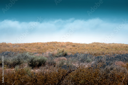 Picturesque color landscape. Multicolored grass on the prairie against a blue sky. The concept of natural minimalism in design