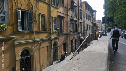 Picturesque Roman street scene with historic buildings and a pedestrian walking by.