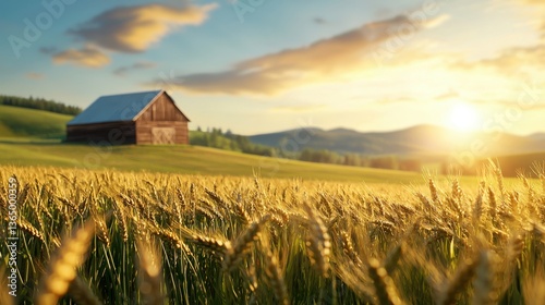 Picturesque sunset over a serene and pastoral countryside landscape featuring a traditional rustic barn nestled in a golden wheat field