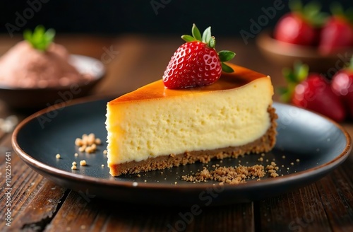 Piece classic cheesecake strawberries, dessert photo restaurant. AI Generative