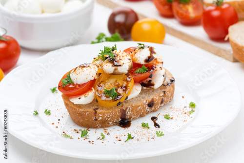 piece of ciabatta with mozzarella and colorful cherry tomatoes