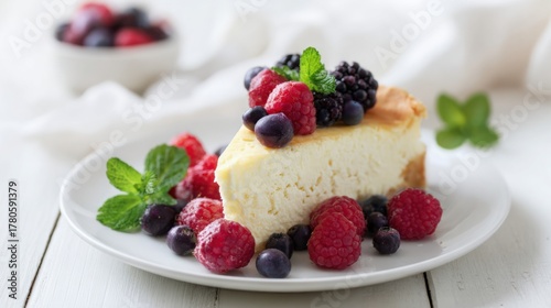piece of delicious cheesecake with fresh berries and mint served on white wooden table, close up, soft natural lighting, detailed texture, elegant