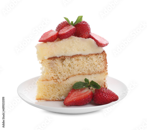 Piece of tasty cake with fresh strawberries and mint isolated on white