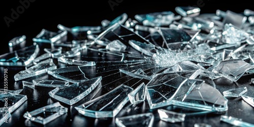 Pieces of broken or cracked glass on black surface, shattered, shattered glass, cracked, shattered pieces, pieces of glass