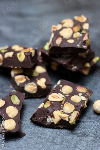 Pieces of dark chocolate with nuts on a gray background, top view, copy space. Homemade chocolate bar. Healthy eating concept.