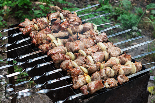 meat, onion, pepper, skewer, fire, coal, nature, river, day off, grass, green, smoke, salt, vinegar, food