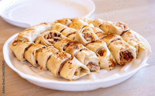 Pieces of shawarma on wooden table with dips and arranged on white plate