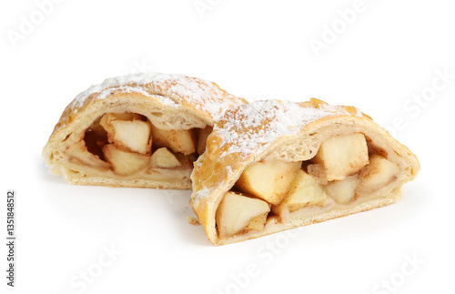 Pieces of tasty apple strudel with powdered sugar isolated on white