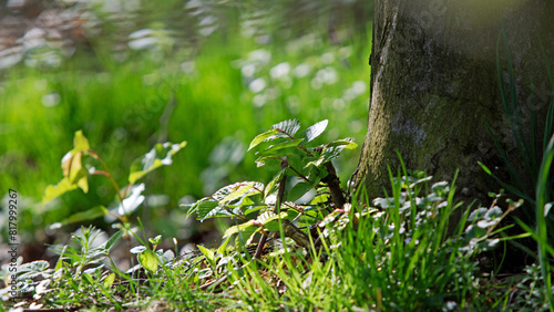 Piękne wiosenne rośliny przy konarze drzewa w lesie.