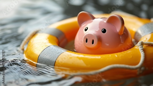 Piggy Bank in Lifebuoy Symbolizing Financial Security and Savings Support