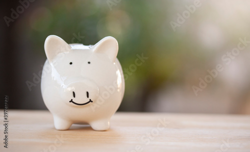 Piggy bank on old wood vintage style and copy space using as background concept to saving money, money for future with bokeh background.