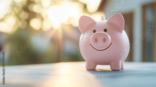 Piggy bank with a smile, symbolizing savings and financial success in a warm, bright setting.