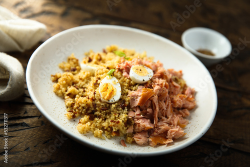 Pilau with salmon and quail eggs