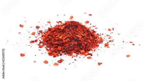 pile crushed red cayenne pepper, dried chili flakes and seeds on white background.