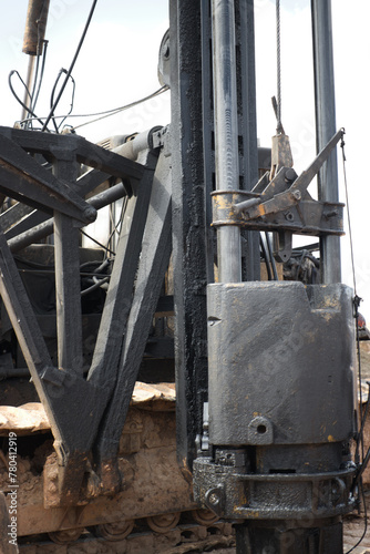 Pile driving machine. Diesel hammer pile driving machine working on construction site. Preparation of the pile foundation for the construction of the building. Close-up.
