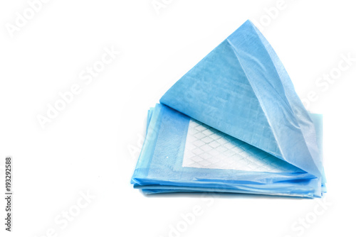 pile of absorbing pads for pets isolated on white. home training carpets for animals