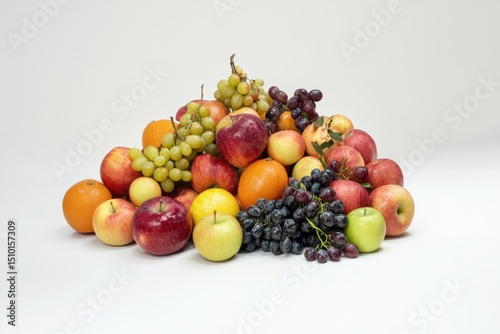 Pile of assorted fresh fruits on white background. Apples, grapes, oranges, lemons, and pomegranates. Vibrant colors. Clean studio light. Healthy eating, nutrition, and harvest concept. Copy space