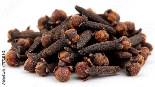 clove, spice, food, herb, spice, dried, brown, dark, pile, heap, whole, aromatic, cooking, kitchen, natural, organic, healthy, nourishment, cookery, ingredient, seasoning, epicure, blend, ground, rack, foodstuff, product, isolated, white, background, close, up, macro, texture, fragrant, pungent, flavorful, edible, herb, condiment, dry, culinary, bulk, flocked, of, ingredient