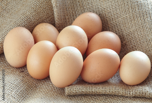 Pile of Brown fresh egg on brown fabric