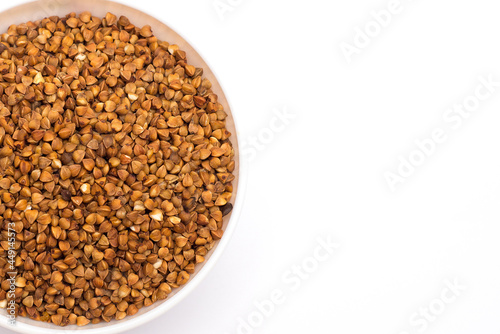 Pile of buckwheat isolated on white background. Top view. Buckwheat. Buckwheat grains. Grain culture.