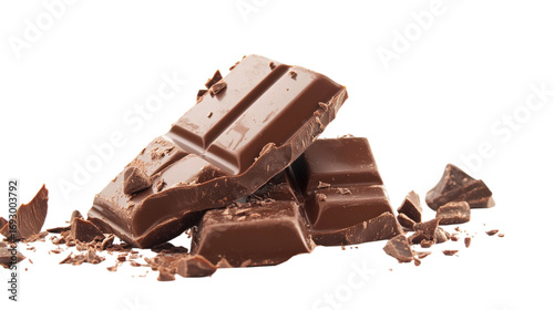 Pile of Chocolate Bar Pieces with Crumbs isolated on a Transparent or white Background